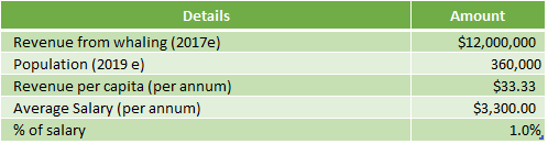 The opportunity of stopping whale hunting is US$33 per person per annum or 1% of earnings.